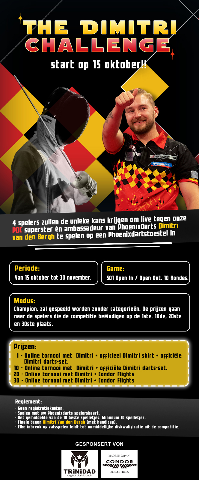 - ·1 - Online tornooi met Dimitri + officieel Dimitri shirt + officiële Dimitri darts-set.