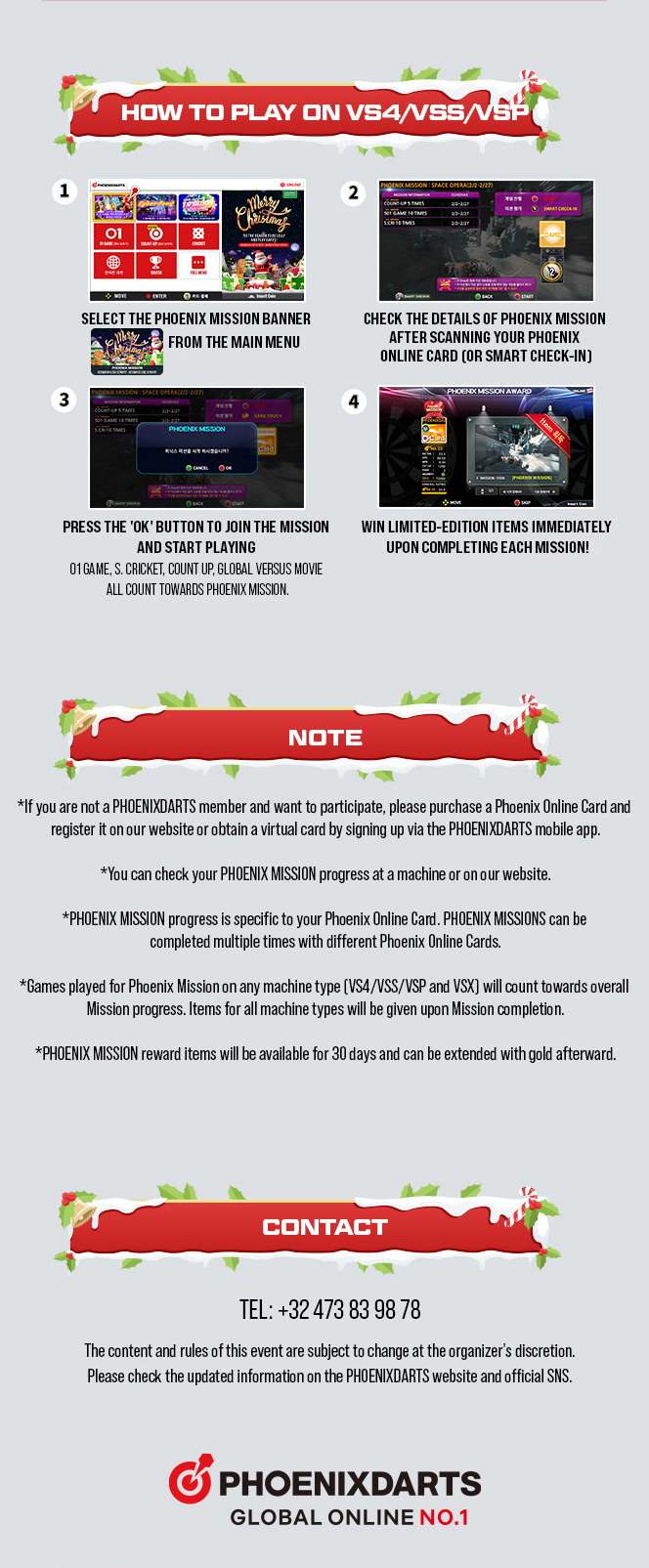 [Event] December Phoenix Mission: Very Merry Christmas 2024-12-02 NEW GAME Cheers Launching Event ▲ 2025-12-16 ▼ PHOENIXDARTS APP RENEWAL! 2024-11-19 List