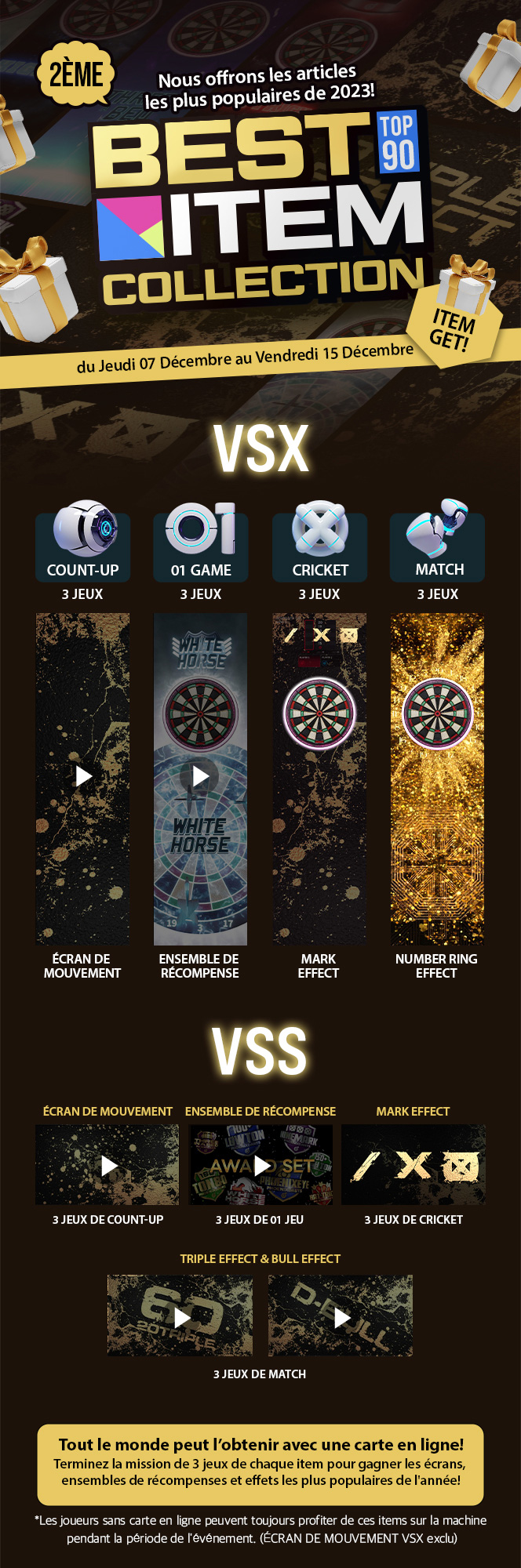 - · Le nombre de jeux pour les articles VSS/VSX est compté séparément. Pour gagner des articles de récompense sur les deux machines, le nombre de jeux requis doit être respecté sur chaque type de machine.