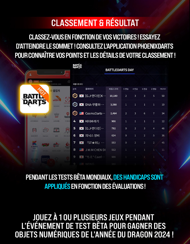 [Event] BATTLE DARTS GLOBAL BETA TEST 2024-03-15 LANCEMENT DU NOUVEAU JEU Cheers ▲ 2025-12-16 ▼ PHOENIXDARTS SPORTS | CHAPTER 5. BASEBALL 2024-03-13 List