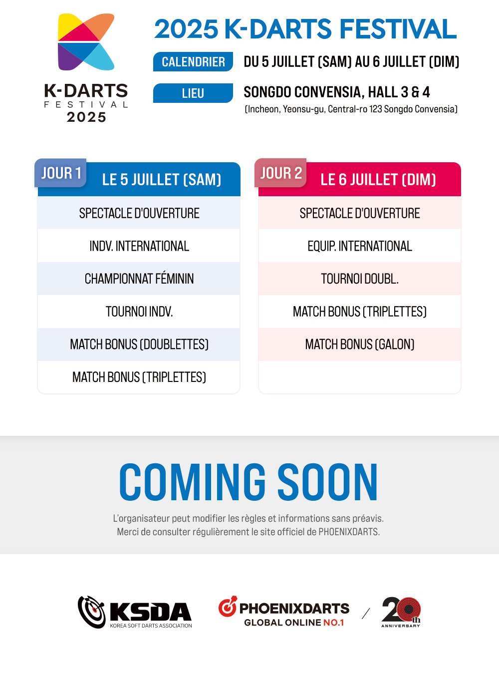 [Event] 2025 K-DARTS FESTIVAL Preview 2025-04-17 LANCEMENT DU NOUVEAU JEU Cheers ▲ 2025-12-16 ▼ Fishing King Announce du Gangnant 2025-04-07 List