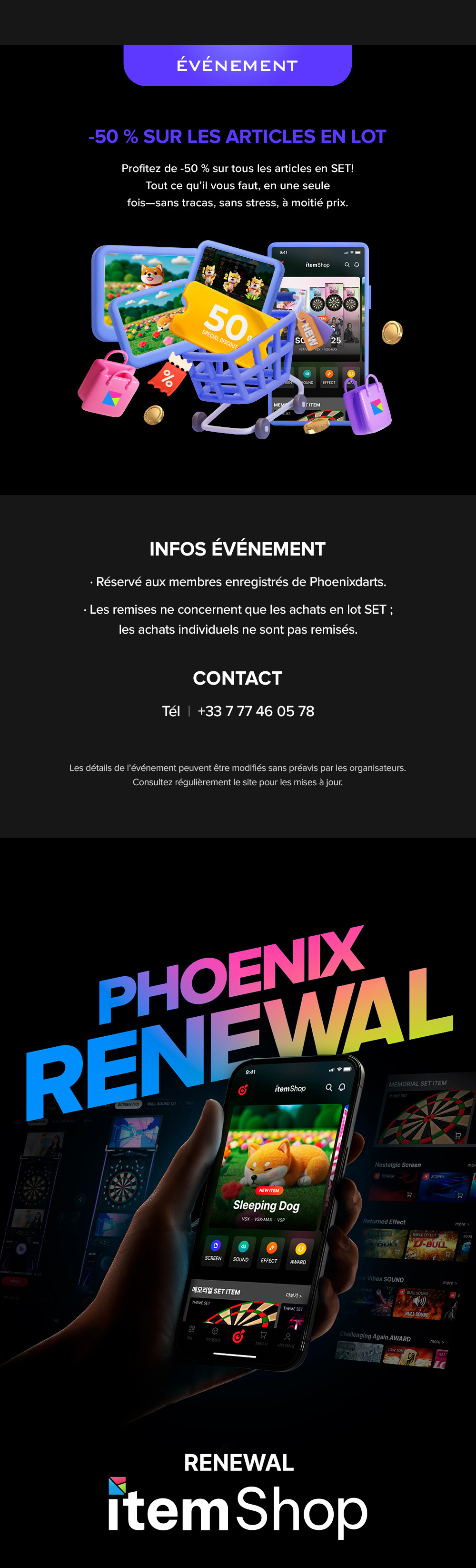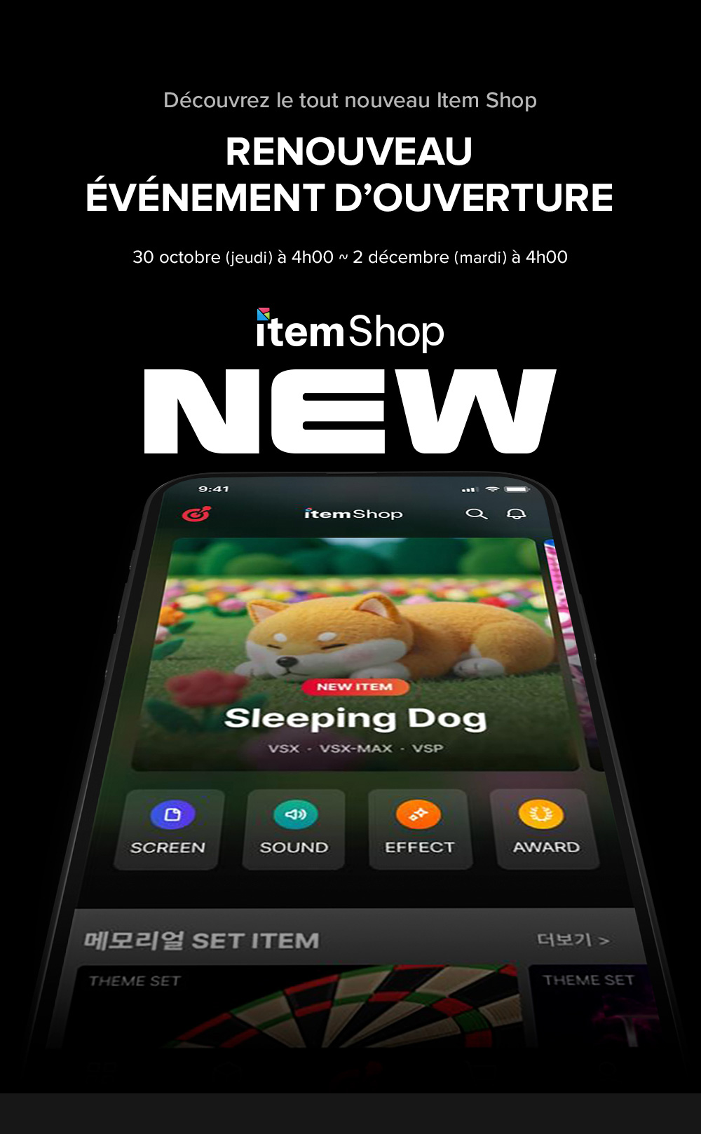 [이벤트] ÉVÉNEMENT D’OUVERTURE DU NOUVEL ITEM SHOP 2025-10-31 LANCEMENT DU NOUVEAU JEU Cheers ▲ 2025-12-16 ▼ Réouverture de l'ITEM SHOP Phoenixdart ! 2025-10-30 목록