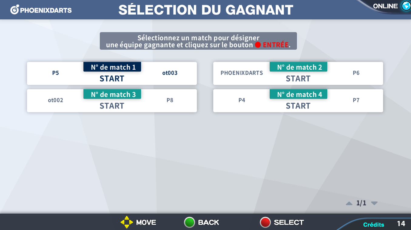 Après avoir décidé l'équipe gagnante du match, sélectionner le match et cliquer sur le bouton, ● SELECT