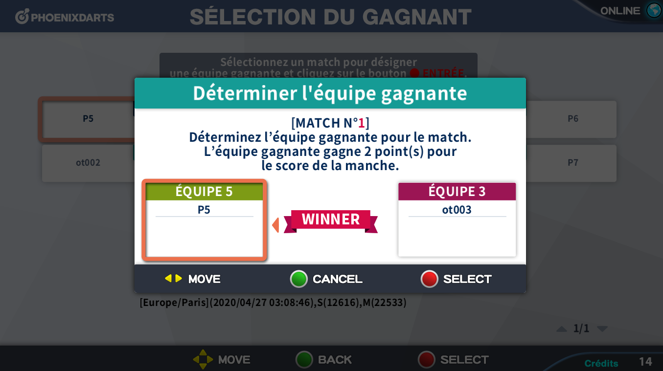 ● S'il y a eu des problèmes en cours du match ou s'il faut changer le résultat du match, il est possible de sélectionner l'équipe gagnante manuellement.