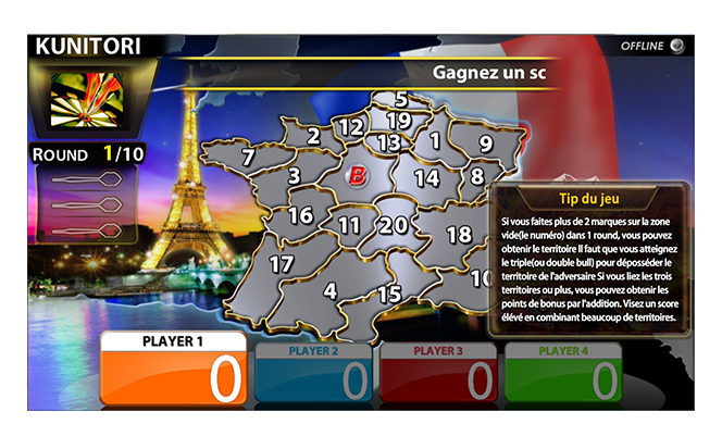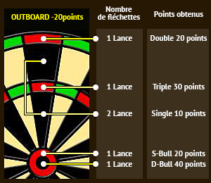 Vous pouvez obtenir 10 points en 2 simples, double c'est 20 points, triple c'est 30 points, simple bull c'est 20 points,