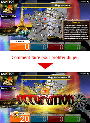 (1) Si votre territoire est adjacent avec trois ou plus, le bonus de * nombre de territoire adjacent X 10 points* sera donné.(2) Si vous obtenez les trois territoires de suite par un tour, un bonus de 100 points sera donné