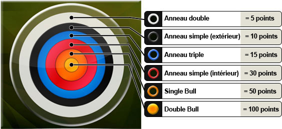 Un jeu de fléchettes dont la cible est présentée comme une cible de tir à l'arc. Chaque cible a ses points correspondants. Vous gagnez des points en atteignant ces segments. Plus vous êtes prêt du centre, plus vous marquez de points.