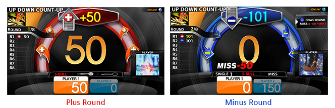 Dans un tour négatif, les points marqués sont soustraits. Si lors du tour négatif la fléchette manque la cible (dehors), 50 points seront soustraits