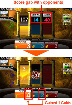 Si le joueur 1 parvient à atteindre 14, il égalise avec le joueur2 et le joueur 1 peut gagner 1 GOLD du joueur 2. Le joueur 2 qui a été rattrapé perd la moitié de ses points.