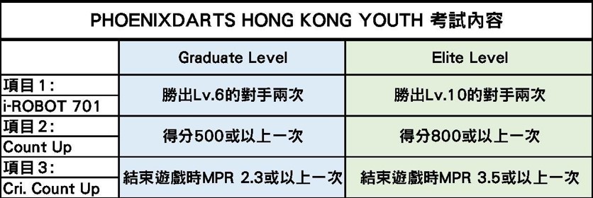 首要通過*PHOENIXDARTS YOUTH能力試, 為統一推廣青少年飛鏢比賽, PHOENIXDARTS將推出YOUTH能力試, 參加者需要30分鐘內完成以下4項能力測試: