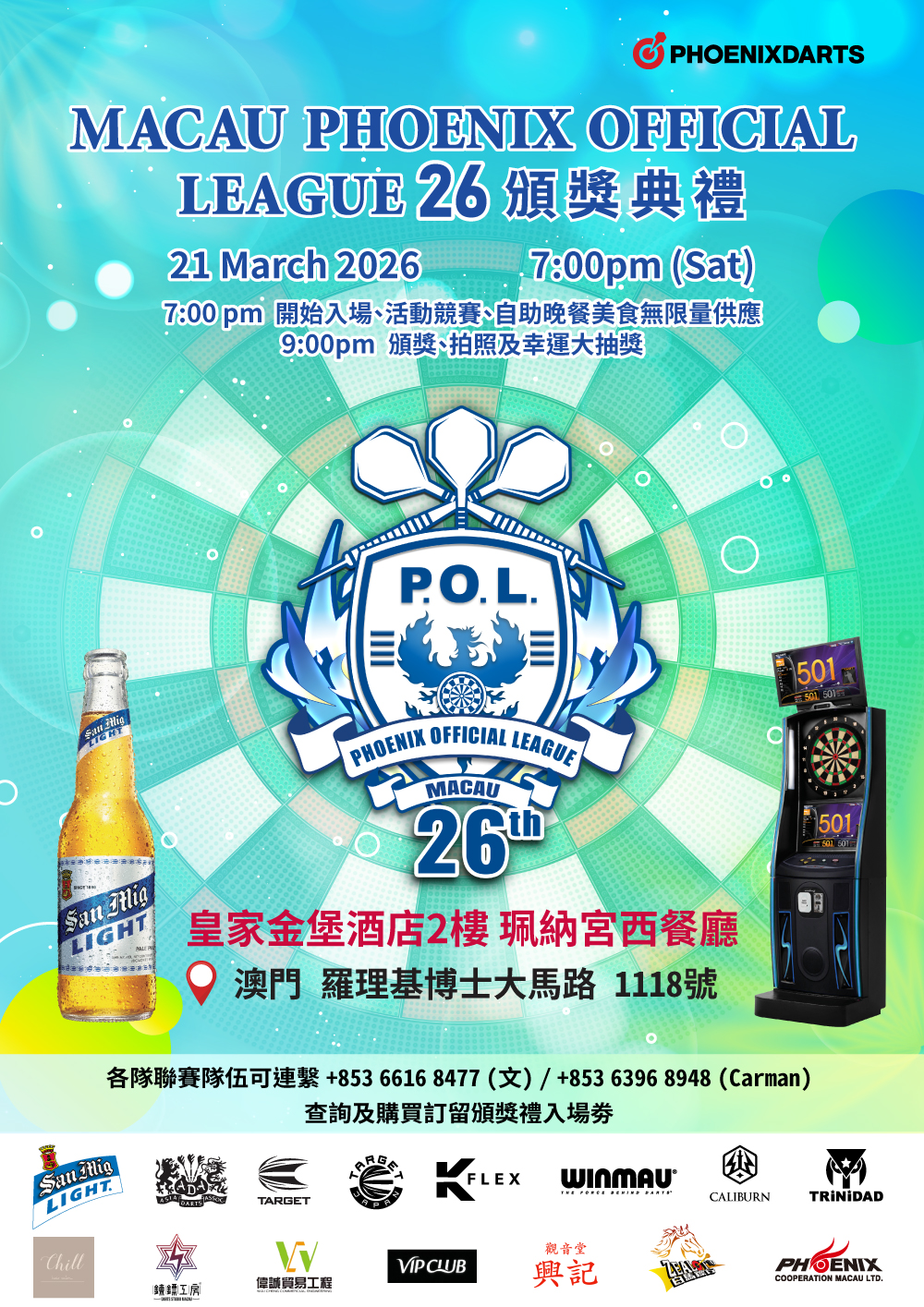 Macau POL 26早前已滿束,首先恭喜各隊及各位得獎隊伍及選手,感謝大家支持同參與Macau POL 26聯賽,我地將定於2026321(星期六) 澳門皇家金堡酒店二樓珮納宮西餐廳 進行頒獎禮。本屆聯賽頒獎典禮除了頒發聯賽獎項給Division1Division 2ADivision2B 共三所有得獎隊伍之外,同時亦會頒發Division1Division 2個人獎項男、女子Top player9MarkMost Hat Trick。同時亦會隨即場共1889MarkTon80Hat Trick之個人嘉許紀念襟章亦會在當晚派發