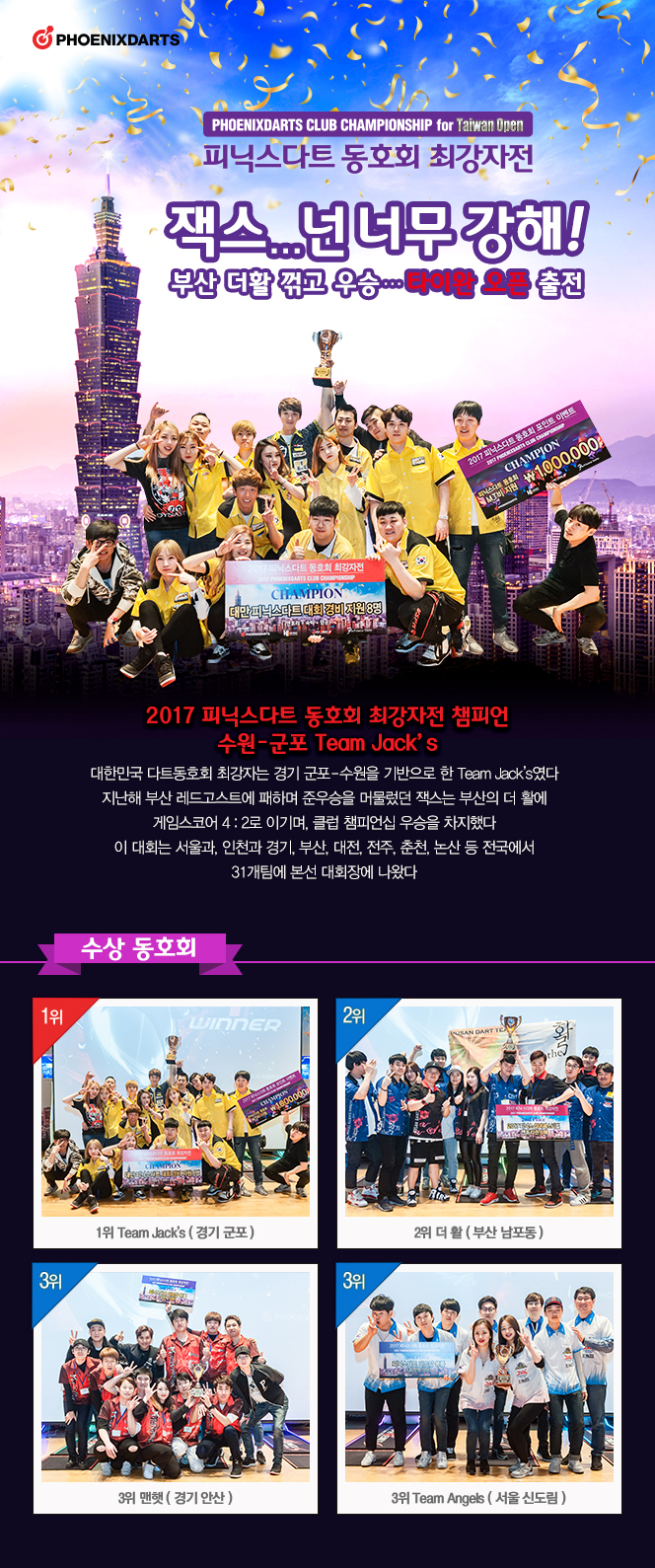 [이벤트] 2017 피닉스다트 동호회 최강자전 결과 2017-04-11 10월 신규 아이템 업데이트! ▲ 2025-10-01 ▼ (사)대한다트협회 결제시스템 이관 관련 공지문 2017-04-11 목록