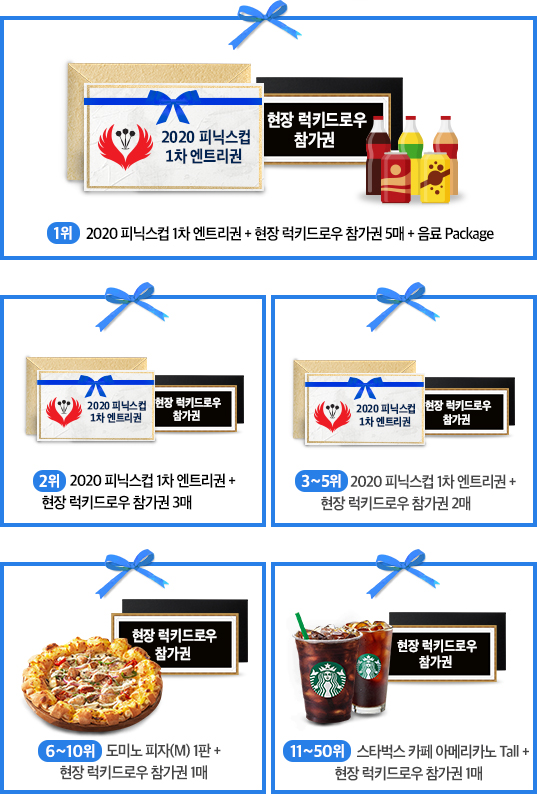 | 1위 | 2020 피닉스컵 1차 엔트리권 + 현장 럭키드로우 참가권 5매 + 음료 Package |