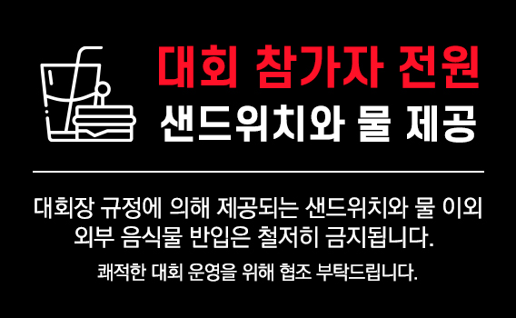 - 4. 선수가 무대에서 경기를 진행하는 경우 음료는 1개의 텀블러만 소지할 수 있다. 텀블러는 넘어졌을 때 내용물이 흐르지 않도록 뚜껑이 있어야 한다.