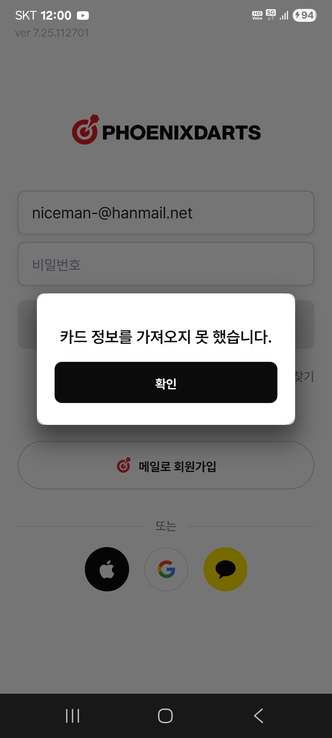 11월28일 부산 501펍에서 다트를 하던중 피닉스다트 어플에 접속을 했는데 "카드정보를 가져오지 못했습니다"라는 문구가 계속 뜨면서 접속이 안됩니다.처리좀 부탁드립니다.