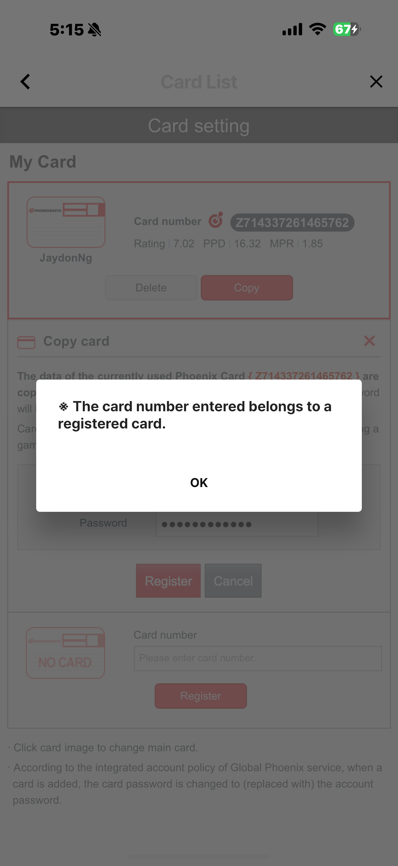 [Phoenix Card] New card but need to register to my main account but now i add one more card lol