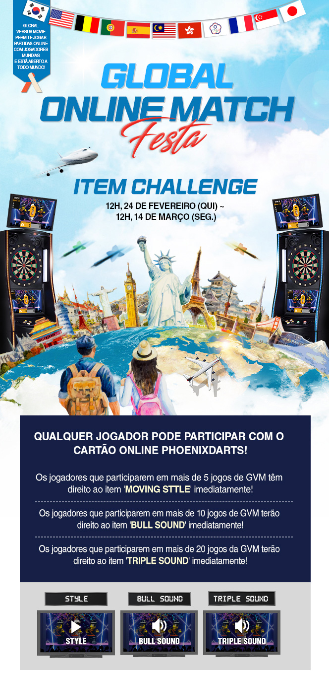 - *Os itens MOVING STYLE/BULL SOUND/TRIPLE SOUND serão automaticamente fornecidos ao cartão online após completar mais de 5/10/20 jogos no GVM. (Os itens premiados também podem ser verificados imediatamente na máquina ou na LOJA DE ITENS.)