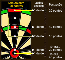 2 Singles são 10 pontos, os duplos são 20 pontos, os triplos são 30 pontos, o Out Bull é 20 pontos e o In Bull é 40 pontos.