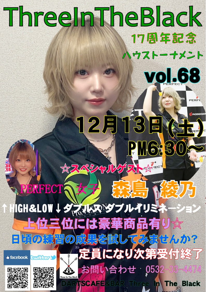 12月13日(土)18時30分よりPERFECT女子で活躍中の『森島 綾乃』プロをお招きして『第68回ハウストーナメント17周年記念大会』を開催いたします‼️